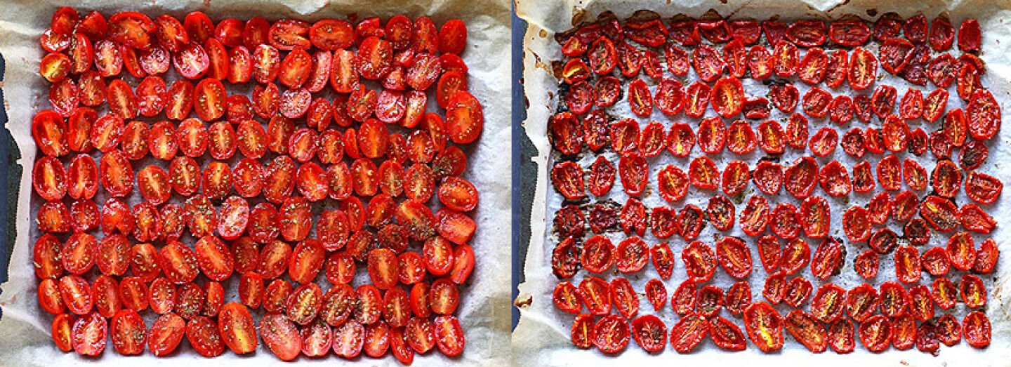 If using tiny tomatoes reduce the baking time to 1h 15m to 1h 30m. If desired, turn off the oven and leave the tomatoes to dry in the residual heat for another half hour (depending on how dry they already are).